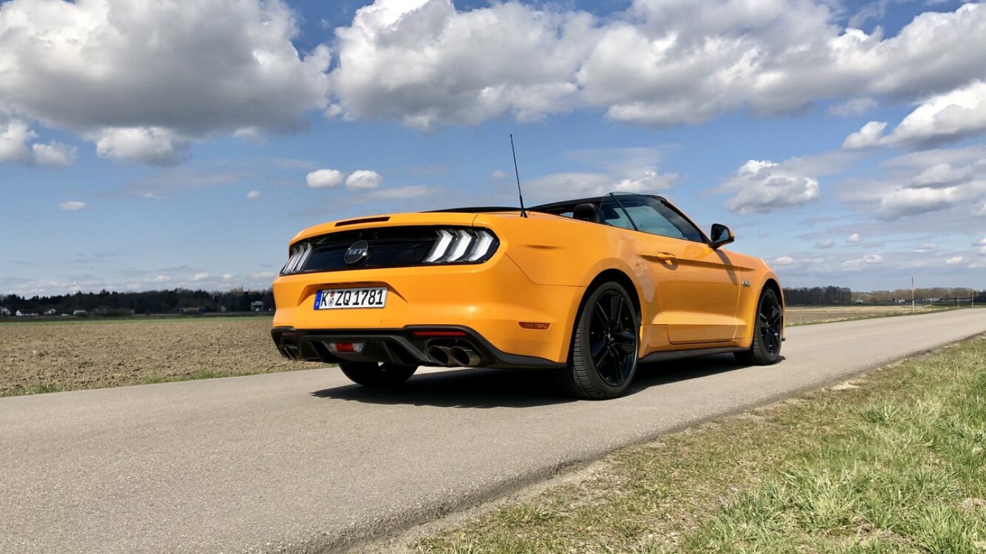 Auch er sagt der Gegenwart „hallo“ und fährt auf Wunsch mit einem aufgeladenen 2.3 EcoBoost-Vierzylindermotor vor. Und das übrigens besser, als manch Abwinker gleich denkt. Aber das ist eine andere Geschichte. Im expressiven Twister Orange wirft der Mustang-Testwagen erst sein Stoffdach nach hinten, und dann seinen fünf Liter großen Sauger-V8 an. 450 PS lässt er sich bei Bedarf heraushämmern, untermalt vom satten Klang der Klappenauspuffanlage. Stets präsent, aber nie vorlaut.