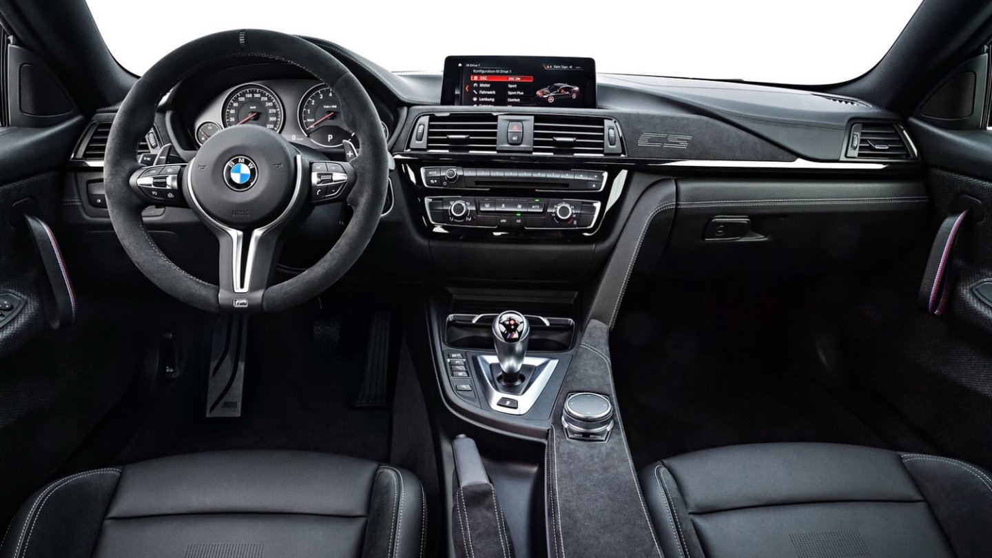 Die Motorhaube, das Dach und die Gelenkwelle sind beim CS aus kohlefaserverstärktem Kunststoff hergestellt, die Tür-Innenverkleidungen mit spartanischen Zuziehschlaufen aus gepressten Naturfasern. Das drückt das Leergewicht des BMW M4 CS mit serienmäßigem Doppelkupplungsgetriebe auf 1.580 Kilogramm. Ein mit der gleichen Getriebeoption ausgestatteter M4 mit Competition-Paket bringt 1.615 Kilogramm auf die Waage. Trotzdem muss der M4 CS-Kunde im Alltag keinen Verzicht üben: Komfortextras wie Klimaautomatik, das große Navigationssystem namens Professional und Soundanlage in ebenso serienmäßig wie Leder und Alcantara im Innenraum.