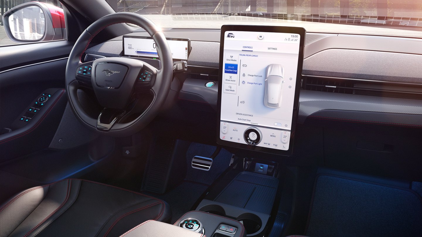 Innen dominiert im Elektro-Ford, auch hier grüßt der Zeitgeist, ein riesiges Display das Geschehen. 15,5 Zoll (39 cm) misst die Bedienoberfläche des neuen SYNC 4-Infotainment. Online-Anbindung, eine aufmerksame Spracherkennung und kabellose Integration von Smartphones über Android Auto und Apple CarPlay sollen alle Bedürfnisse befriedigen.