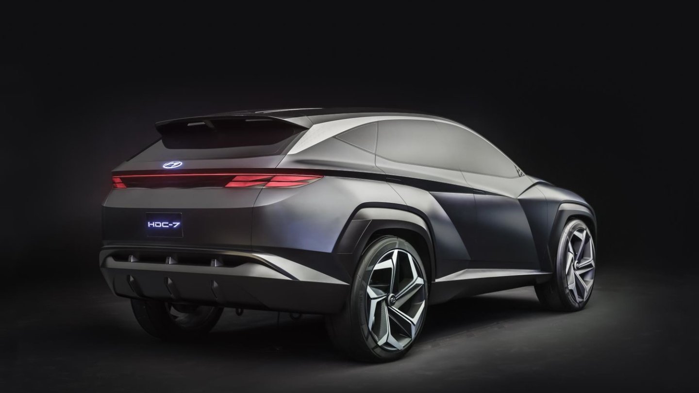 Die Front zeigt eine geschlossene Kühlermaske mit auffälligem Muster. Der Kühlergrill öffnet und schließt sich je nach Luftbedarf und aerodynamischen Vorteilen bei höheren Geschwindigkeiten. Versteckt wurden die Scheinwerfer, die erst mit Beleuchtung deutlich sichtbar werden. In die Frontmaske eingelassene LED-Elemente sorgen für diesen ungewohnten Effekt. Die Neuauflage der Limousine Hyundai Grandeur trägt ein ähnliches Gesicht. Im Profil des Crossovermodells mit flachem Schrägheck werden stark akzentuierte Falzen die leicht eckigen Radhäuser betonen. Insgesamt erinnert das Design auch ein wenig an den Hyundai Nexo mit Brennstoffzelle.