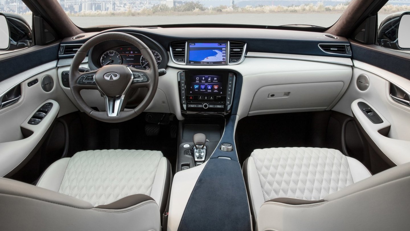 Im Innenraum zeigt sich der neue Infiniti QX50 modern und digital mit gleich zwei großen Displays. Das Infotainment-Modul ist weit oben im Sichtfeld des Fahrers platziert, der Monitor darunter dient als Bedienelement. Das von Nissan bekannte ProPILOT-System zum teilautonomen Fahren im einspurigen Verkehr, also z.B. auf der Autobahn, zieht auch in den QX50 ein.