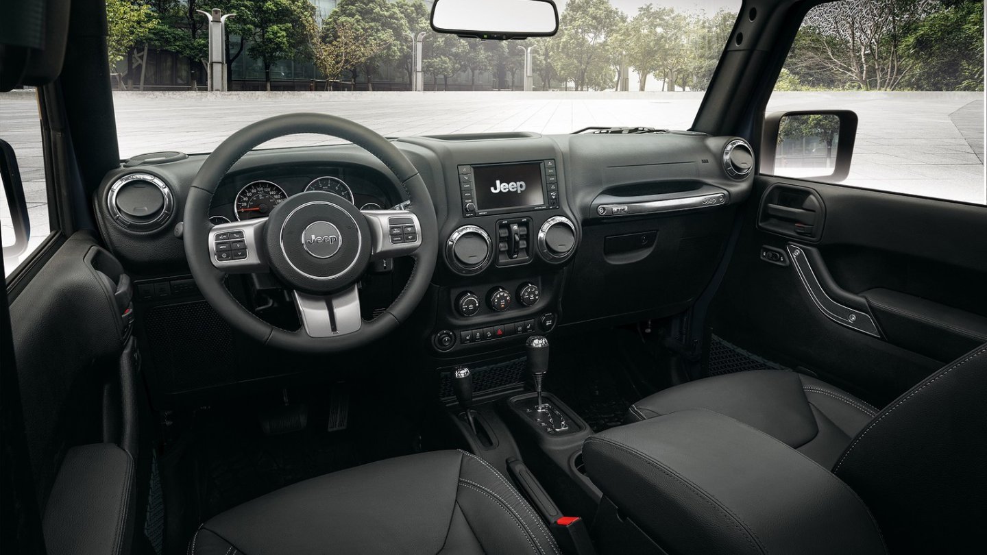 Im Innenraum finden sich eine Lederausstattung mit grauen Kontrastnähten und spezielle Fußmatten zur Party ein. Die Musik dazu tönt aus einem Alpine Soundsystem mit Subwoofer, das alle Jeep Wrangler ab Werk an Bord haben.