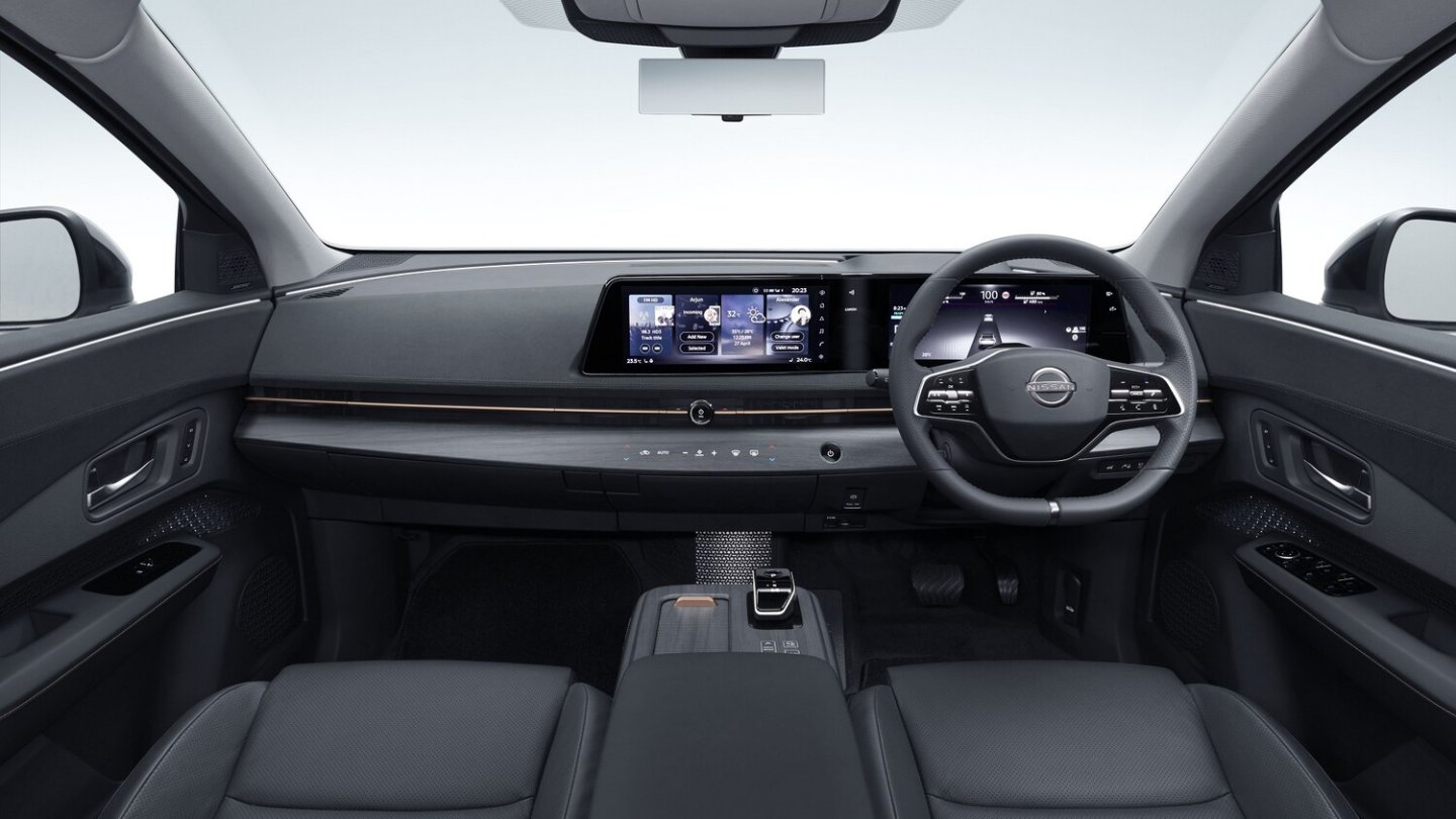 Schon bei der Sitzprobe im Concept Car gefiel das reduzierte Cockpit des Nissan Ariya. Es wurde 1:1 für die Serie übernommen. Auf einer dünnen, verchromten Leiste zeigt sich ein zentraler Dreh-Drückknopf für das Infotainmentsystem, daneben der Warnblinkschalter. Die beiden Displays messen jeweils 12,3 Zoll in der Bildschirmdiagonale. Zusätzlich spiegelt ein Head-up-Display Informationen auf die Windschutzscheibe.