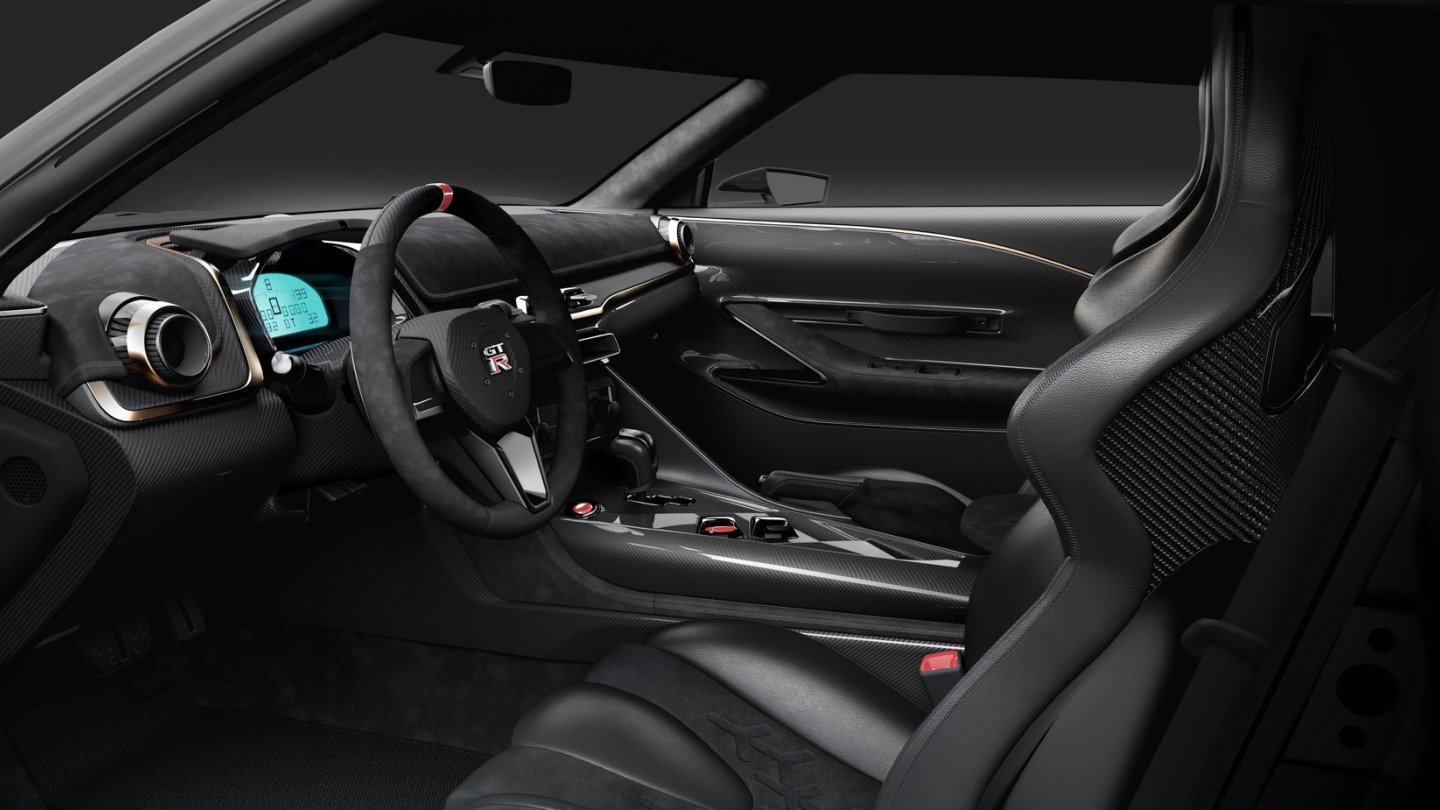 Auch im Innenraum zeigt der Nissan GT-R50 by Italdesign viel Neues. Neue Digitalinstrumente und ein flaches Armaturenbrett wirken modern. Der 3,8 Liter-V6-Biturbo wurde von bisher maximal 600 auf 720 PS leistungsgesteigert. Das wurde nicht per stumpfem Softwareupdate erreicht, sondern mit massiven Eingriffen in den Motor: Größere Turbolader, neue Bauteile wie Kolben und die Kurbelwelle und eine neue Abgasanlage sorgen für den Leistungszuschlag.