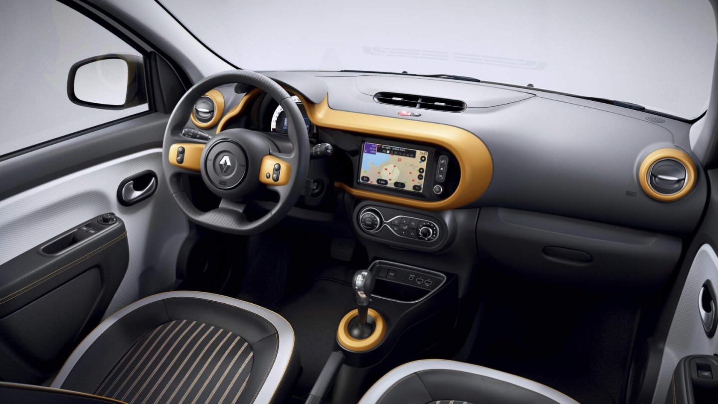 Blaue Dekorelemente an der Karosserie, den Felgen und am Kühlergrill sorgen für den optischen Unterscheid zwischen dem elektrischen Twingo und den Ausführungen mit Verbrennungsmotor, die im Gegensatz zum Smart weiterhin angeboten werden. Auch innen gibt es entsprechende Farbtupfer und ein Infotainmentsystem mit Navigationsgerät im 7-Zoll-Display.