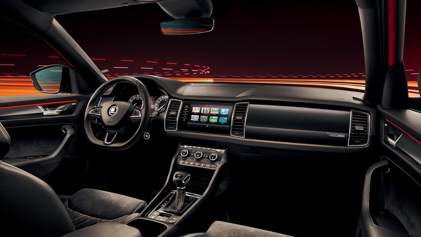 Wie für den Octavia RS und auch den Karoq gibt es für die Sportline-Version des Kodiaq das matte Stahlgrau als Außenfarbe. Innen bleibt es stets schwarz, am Cockpit und den Türverkleidungen gibt es Dekoreinlagen in Karbonoptik.