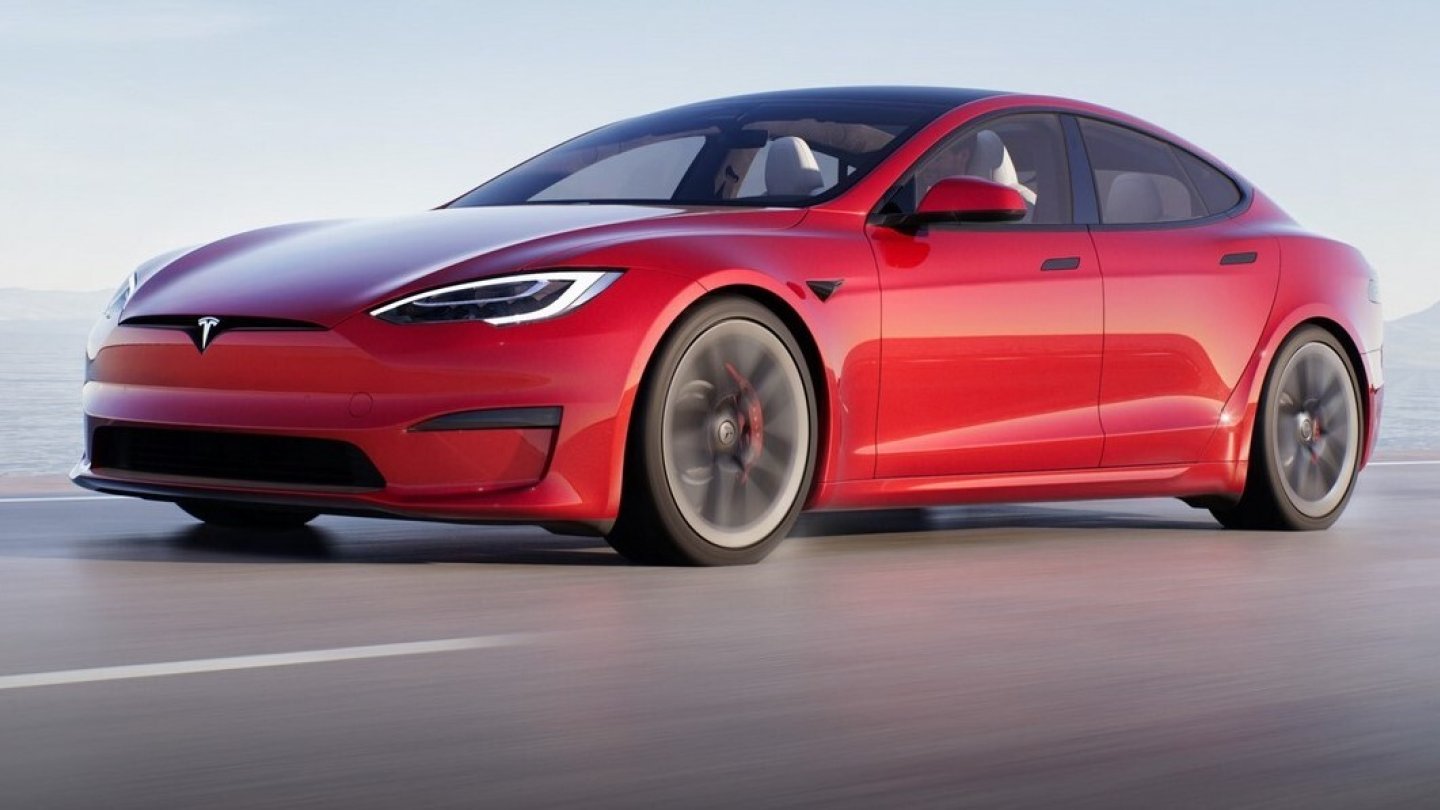 Das Exterieurdesign zeigt leichte Änderungen, zum Beispiel am vorderen Stoßfänger. Zwei Modellvarianten sind aufgelistet: Das Long Range-Modell mit zwei Motoren (670 PS) und „Plaid“ mit drei Motoren und 1.020 PS.