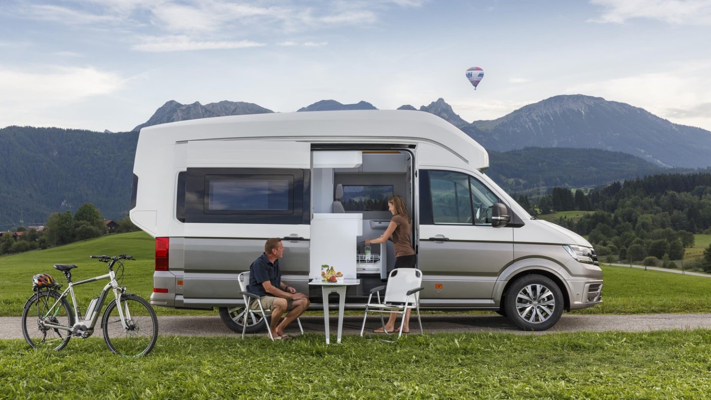 Auch wenn ein mögliches Serienmodell, das nach den ersten Reaktionen „der Szene“ auf den VW California XXL ziemlich sicher bald verabschiedet werden dürfte, nicht ganz so luxuriös wie die Messestudie daherkommt, dürfte es doch eine neue Klasse begründen: die der Luxus-Freizeitmobile. Für Menschen, die früher California (oder Mercedes Marco Polo) fuhren und den Lebensstil behalten wollen, ohne sich aber zu sehr einzuschränken. Die fahren dann auch nicht mehr mit dem Bike den Berg herunter, sondern fahren mit dem Pedelec zum Strand. Wie schön, dass die PR-Fotografen das schon berücksichtigt haben.