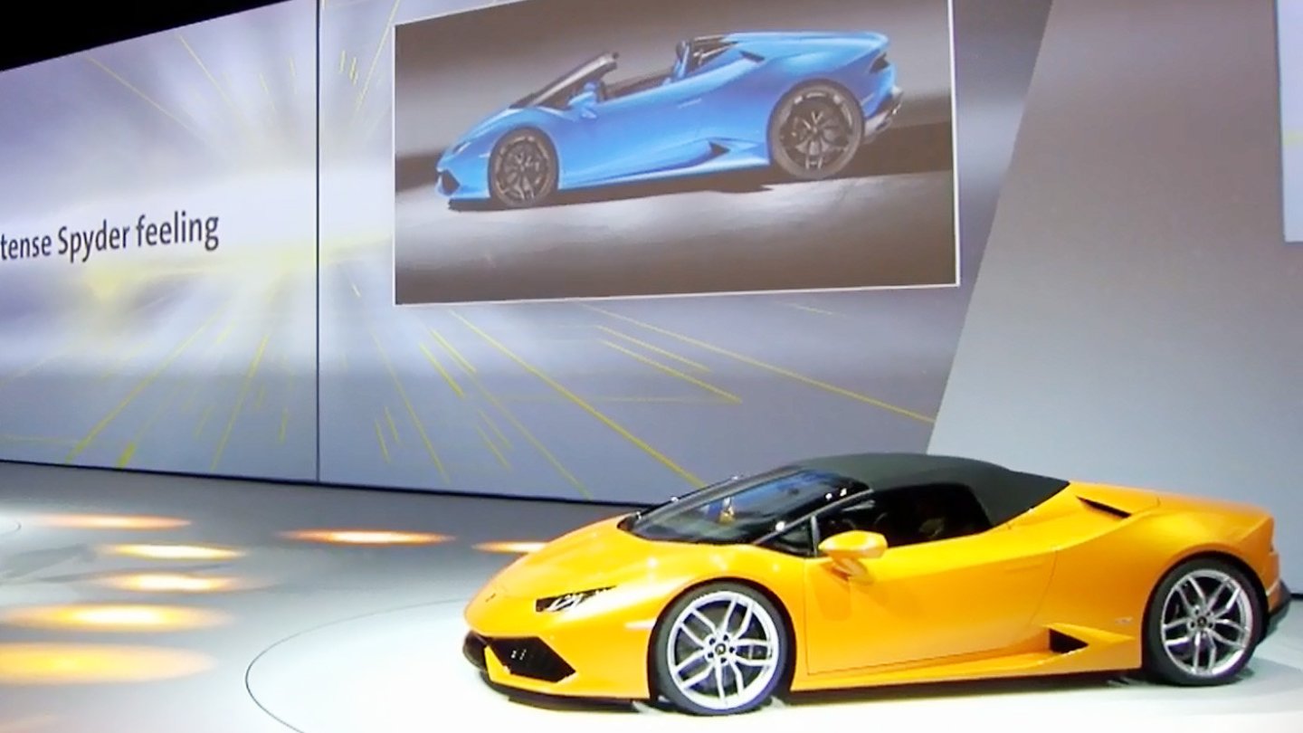 Die Italiener fahren mit zwei Autos rein, und zwar zwei Huracan Spyder LP 610-4. Dazu gibt’s einen virtuellen Lichtschauer auf eine Gletscher(?)-Oberfläche. Ein Fingerzeig in Richtung Klimawandel? Passt nicht so sehr zu einem Supersportwagen. Lamborghini-Chef Winkelmann, jetzt auch trendig mit Vollbart, zeigt den offenen Huracan, kündigt nach dem Spyder weitere Huracan-Modelle an. Kennt man ja von Gallardo und Co. Mit nur einem Modell begnügen sich die französischen Konzernkollegen…