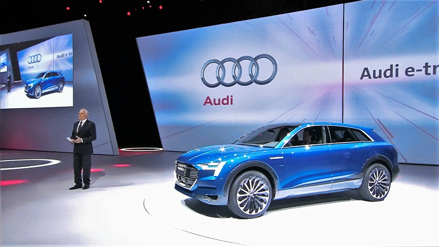 Erst darf sich kurz der A4 zeigen, aber jeder hält den Atem für die eigentliche Premiere des Abends an: „Man muss nicht erster sein, aber der beste“ sagt Audi-Chef Rupert Stadler. Und dann ist es endlich so weit: Der E-tron quattro kommt. Nicht Silber wie erwartet, sondern blau. Jetzt darf Ulrich Hackenberg ran, der bei Audi den Elektromotor ja wieder ins Entwicklungsspiel gebracht hat. Aktive Motorhaubenlamellen zur Lüftung der Elektromotoren. Luftleitstellelement vor dem Hinterrad, ausfahrbarer Diffusor am Heck und viele andere aerodynamische Feinheiten haben wir so bei einem Auto noch nicht gesehen. Die Reichweite soll über 500 km betragen, und danach reicht ein Imbiss. Um Strom für weitere 400 km nachzuladen, sollen nur 30 Minuten am Stecker nötig sein. Die Studie sieht seriennäher aus als gedacht. Vorsprung durch Technik scheint sich wieder mit Leben zu füllen. 2018 soll das Auto auf den Markt kommen. Damit können wir dann auch über die Alpen stromern, es wird nochmal italienisch…
